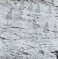 Wie ein anderes Modell zeigt, straffte sich die Figur durch die bestimmende Mittellinie immer mehr. Auch in den unteren Vierecken stehen senkrechte Linien. Die Wölbung erhebt sich im Kulminationspunkt zur Spitze, die durch zwei Bogen wie durch Hörner gekrönt ist. Der Himmelsbogen besteht bei dieser Darstellung aus zwei Dreiecken. Der benutzte Fels trug schon ältere Tierbilder, die durch ihren Charakter als Ordnungssymbole durchaus in die Welt des Geistes gehören.